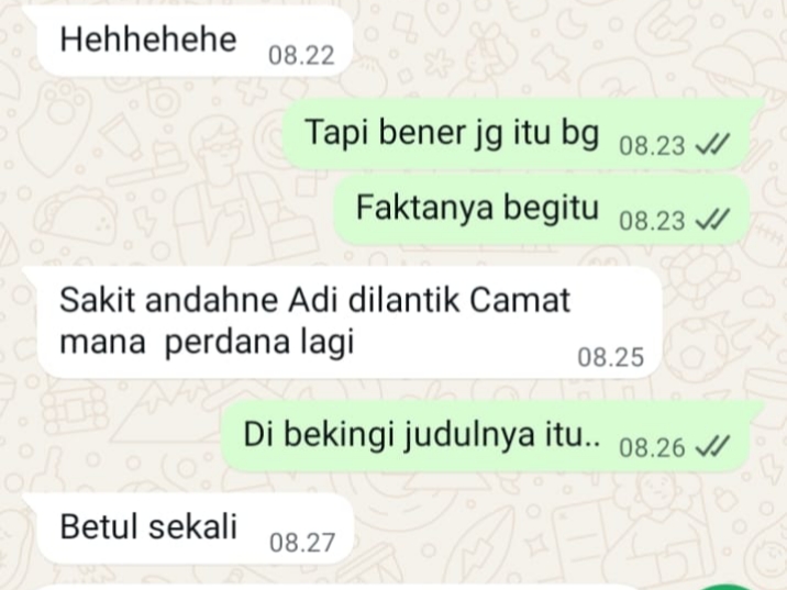 Dari hasil penelusuran indportal.com, obrolan di aplikasi pesan juga menunjukkan kekecewaan serupa. Seorang pegawai mengaku sakit hati karena Adi dilantik menjadi camat, terlebih sebagai pelantikan perdana.